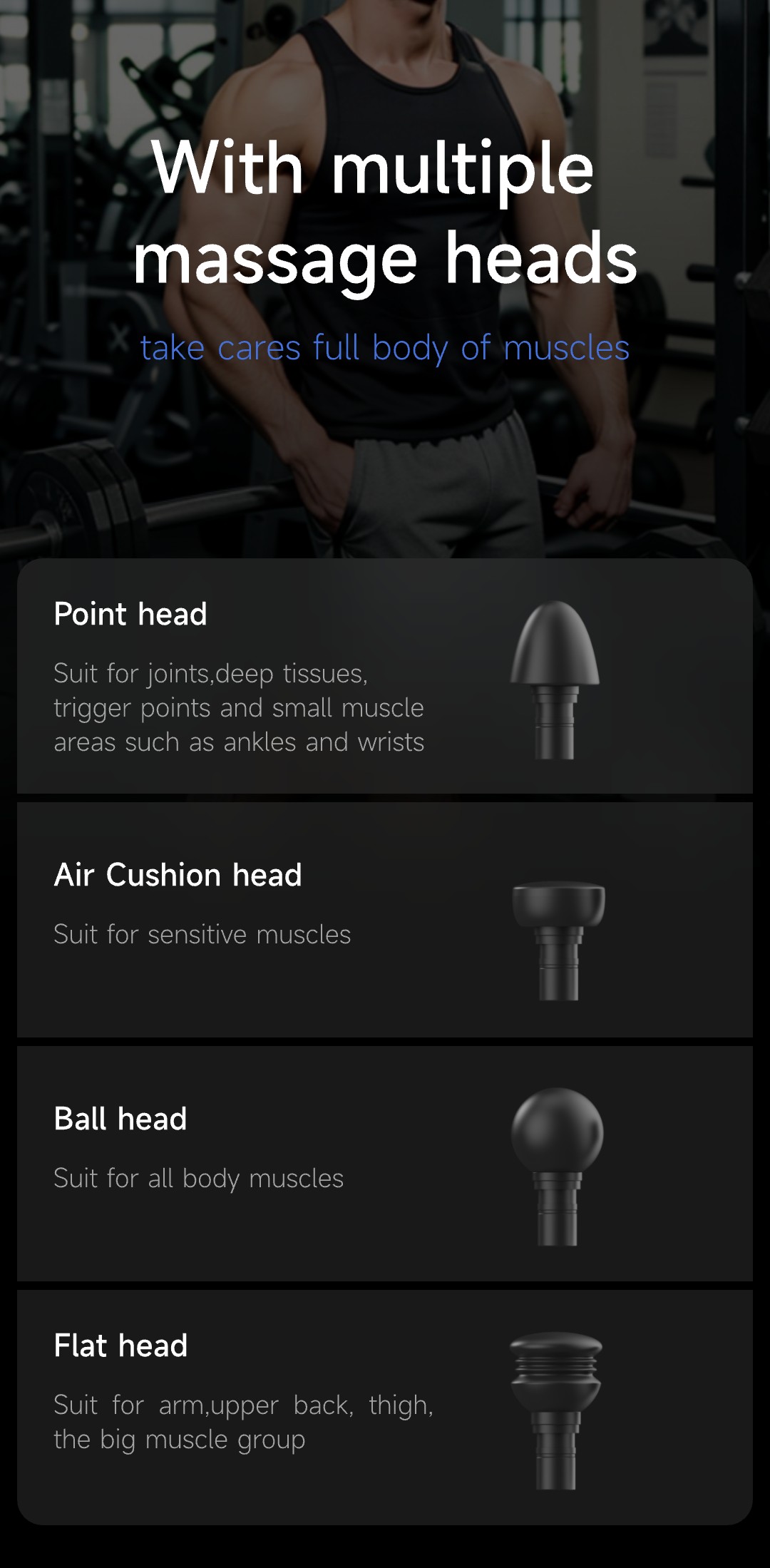 staggered impact to achieve dual head massage efficiency improvement,deep massage, effectively massaging all muscles throughout the body